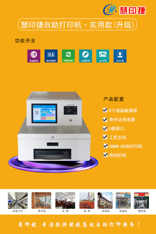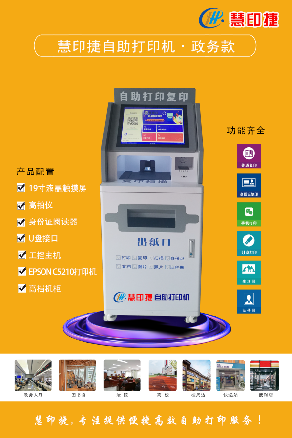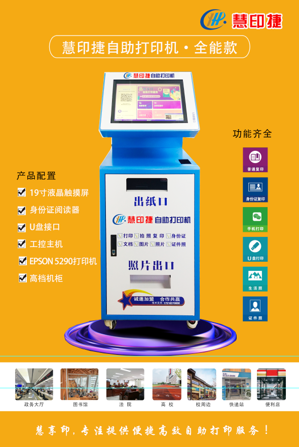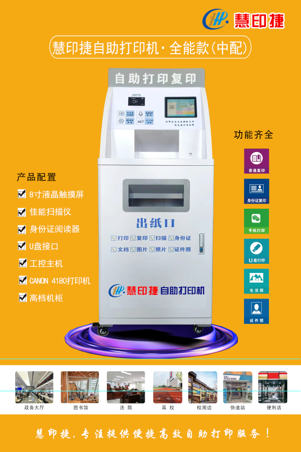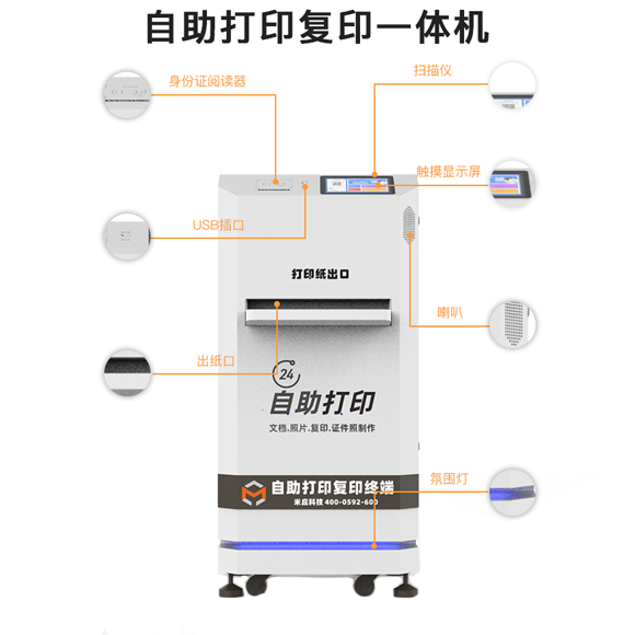 自助打印复印终端是由新乡市康泰科技有限公司自主研发的一款新型智能设备,支持手机扫码打印、扫码取件、身份证复印、U盘打印、扫描复印等功能,应用于需要经常打印和复印的场所,如学校打印店、社区、政府办公大厅、医院等,可做到无人值守,7X24小时持续服务。